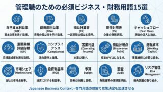 管理職が絶対に知るべき財務・経営用語15選をROE・ROA・キャッシュフローなど実務視点で徹底解説。昇格試験の面接で「御社のROEをどう思う?」と聞かれても自信を持って答えられるレベルに。論文・面接での活用法も紹介。